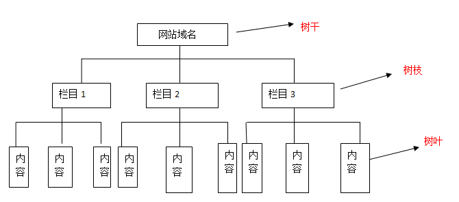网站的树状结构大致可以理解为上图,当然栏目下面可以有子栏目,一般这种结构形式的网站程序也很多,像织梦、帝国程序,每个分类栏目下面都有着很多的内容页,而且也可以添加很多的子栏目,而这些子栏目还可添加子栏目或内容页面。